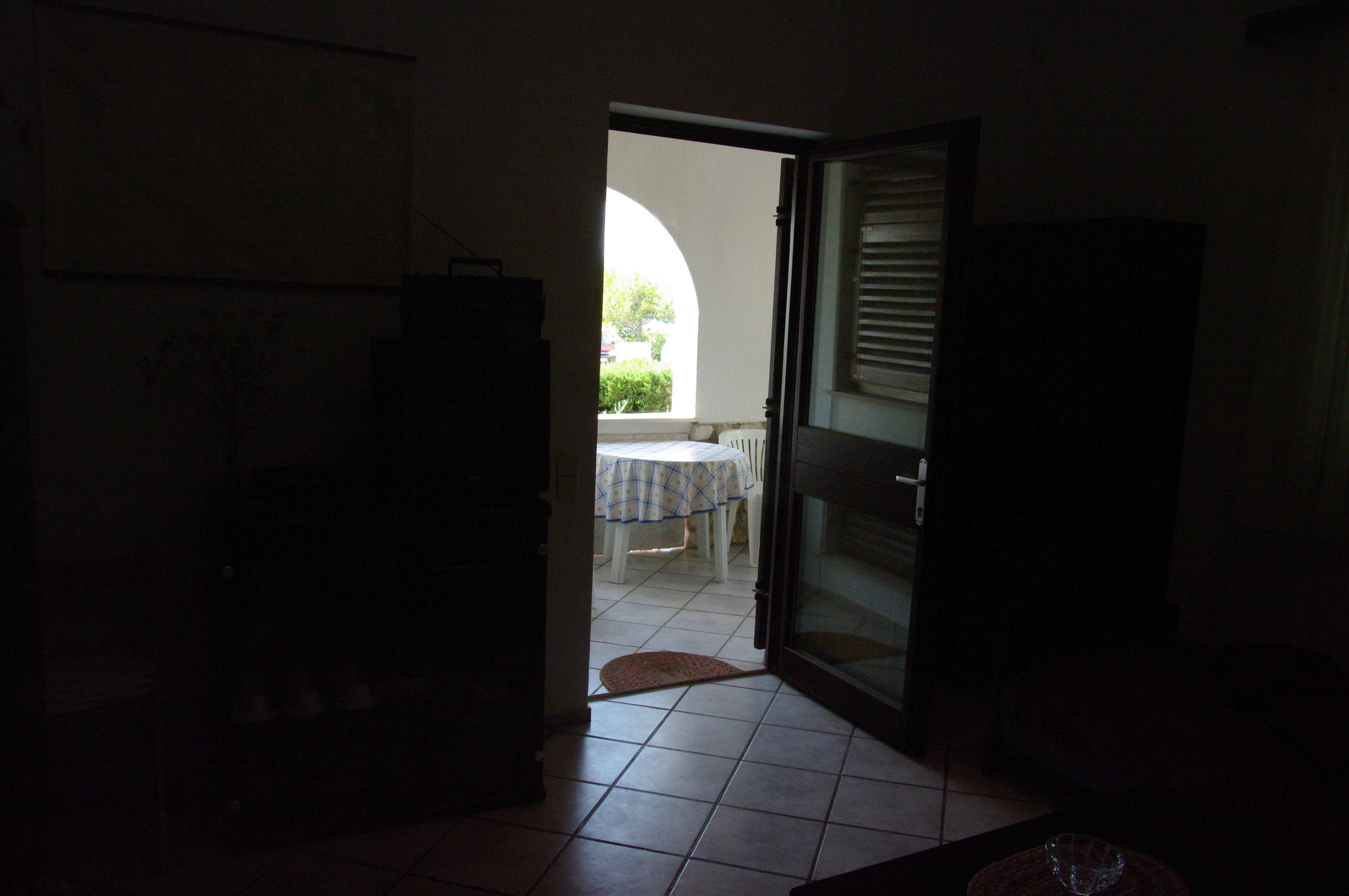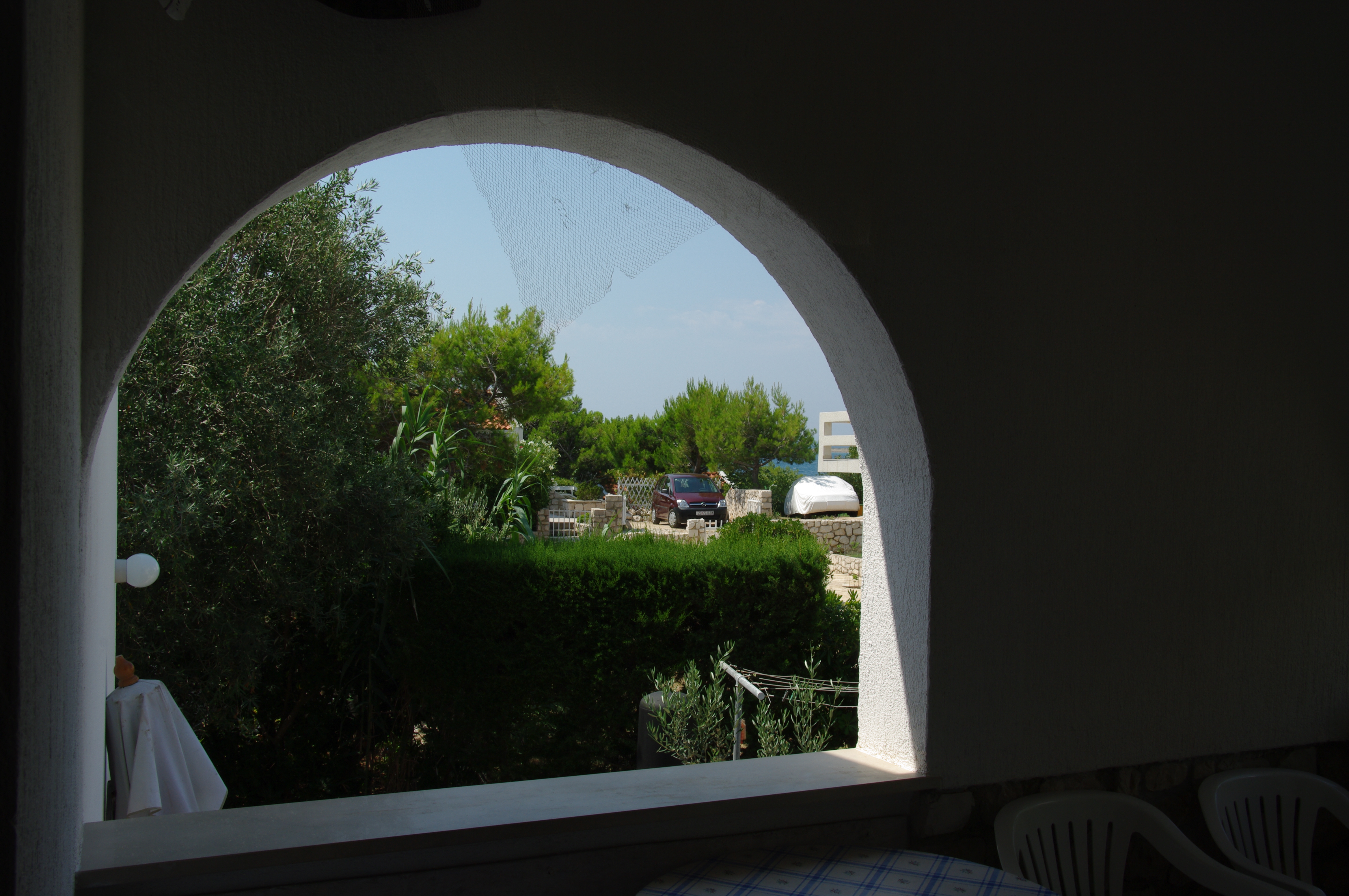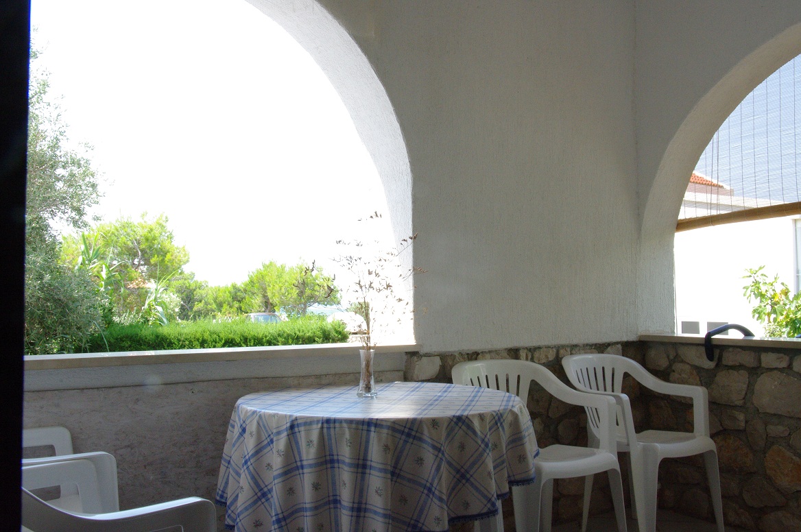Terasa v senci. Sam apartma nima pogleda na morje, predvsem zaradi svoje diskretnosti in je kot neki skriti kotiček samo za stranko samo